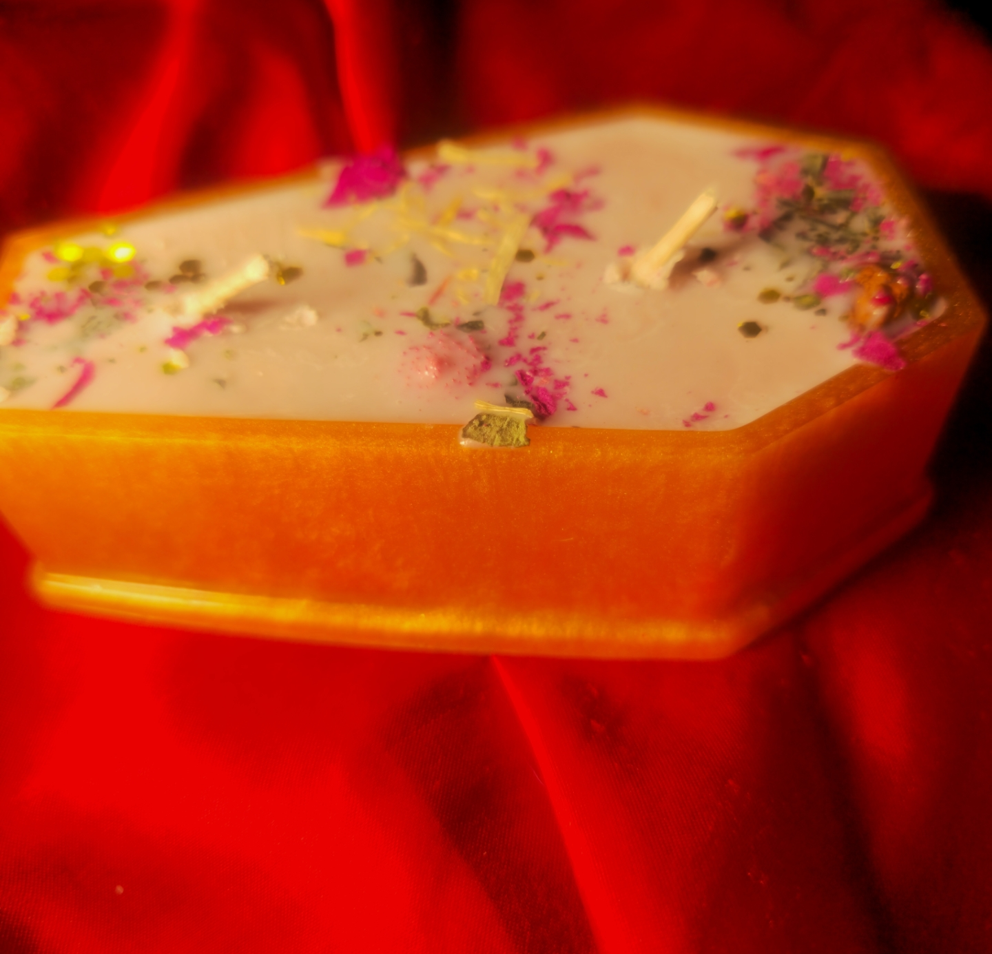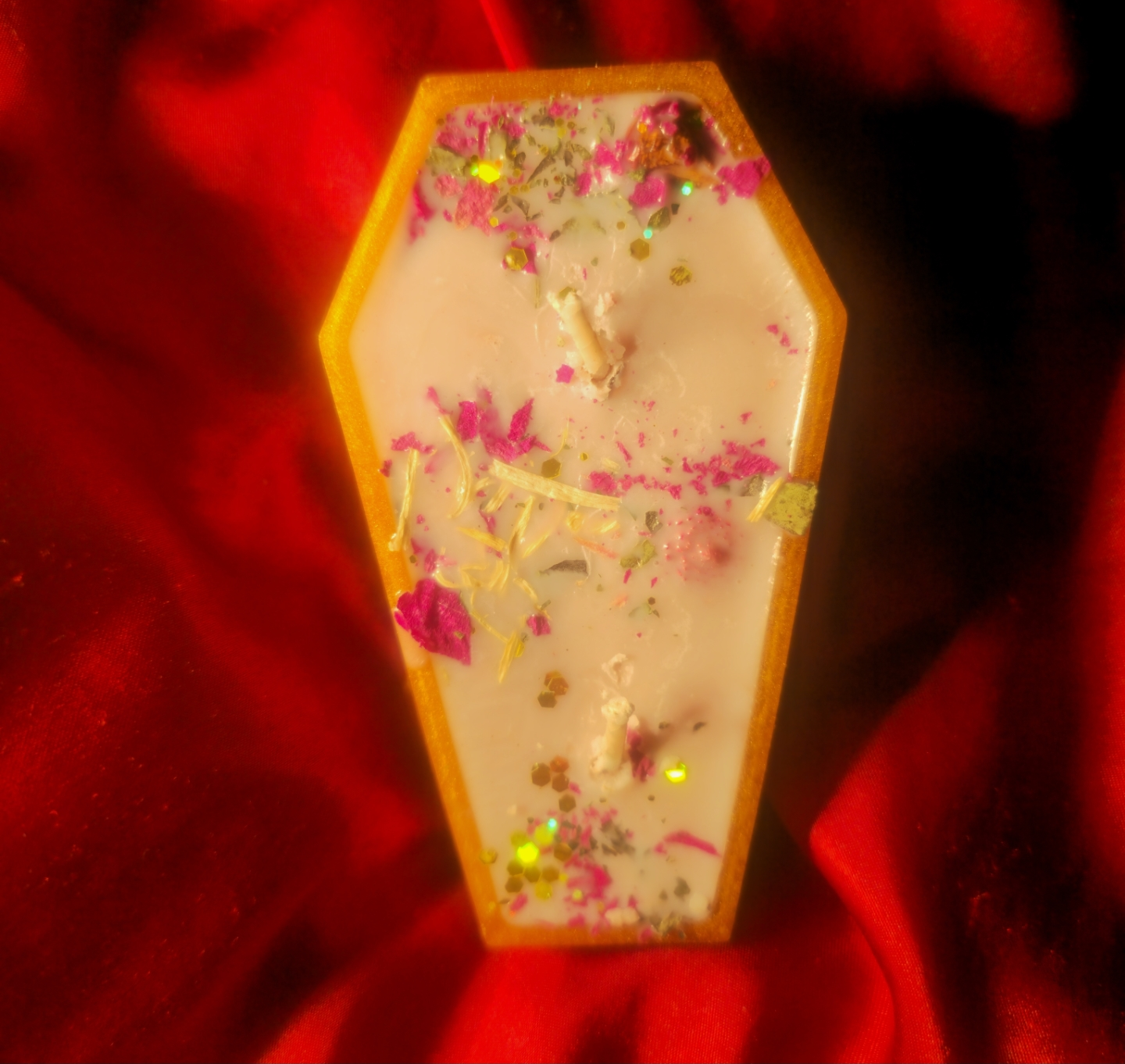 This candle is truly magical.There’s no better way to say “I love you to death” than with my beautifully decorated & hand-poured 100% soy wax candles, infused with beautiful naturally dried herbs. My handmade candles come in two styles of epoxy resin casted coffin trinket boxes. This captivating & ominous candle is made with pure soy wax topped with dried flowers and herbs.. Each coffin shaped candle has 2 cotton wicks that are quiet and burn evenly.. This witchy love gift is 100% handmade & hand poured so each candle is extra unique to its owner and crafted with care and strong intention.WHAT'S INCLUDED:•You will get 1 x handmade coffin candle with soy wax, topped with a variety of dried florals, each candle made with cotton wicks & sometimes these are created by demand.Resin coffin box measures 4.92in x 2.95in & you can use it as a trinket box or gemstone holder once your candle is burned out