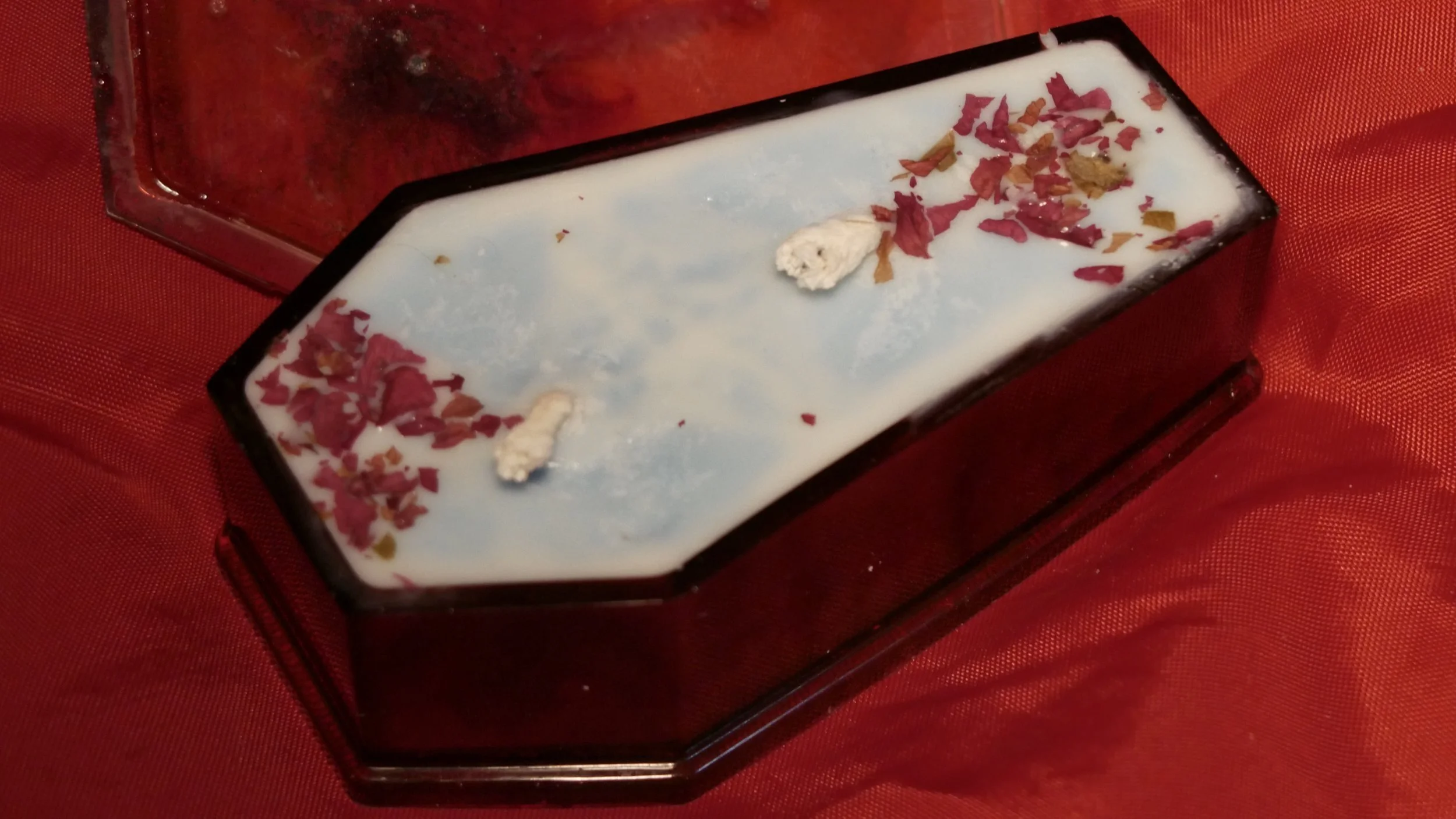 This candle is truly magical.There’s no better way to say “I love you to death” than with my beautifully decorated & hand-poured 100% soy wax candles, infused with beautiful naturally dried herbs. My handmade candles come in two styles of epoxy resin casted coffin trinket boxes. This captivating & ominous candle is made with pure soy wax topped with dried flowers and herbs.. Each coffin shaped candle has 2 cotton wicks that are quiet and burn evenly.. This witchy love gift is 100% handmade & hand poured so each candle is extra unique to its owner and crafted with care and strong intention.WHAT'S INCLUDED:•You will get 1 x handmade coffin candle with soy wax, topped with a variety of dried florals, each candle made with cotton wicks & sometimes these are created by demand.Resin coffin box measures 4.92in x 2.95in & you can use it as a trinket box or gemstone holder once your candle is burned out